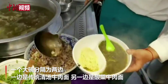 一边清汤鲜美,一边酸酸的。这是兰州鸳鸯牛肉拉面,一锅两味。它看起来胃口很大。