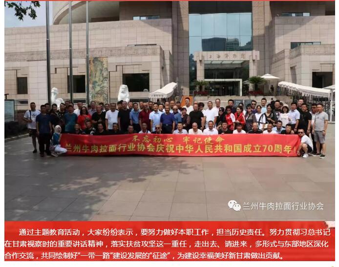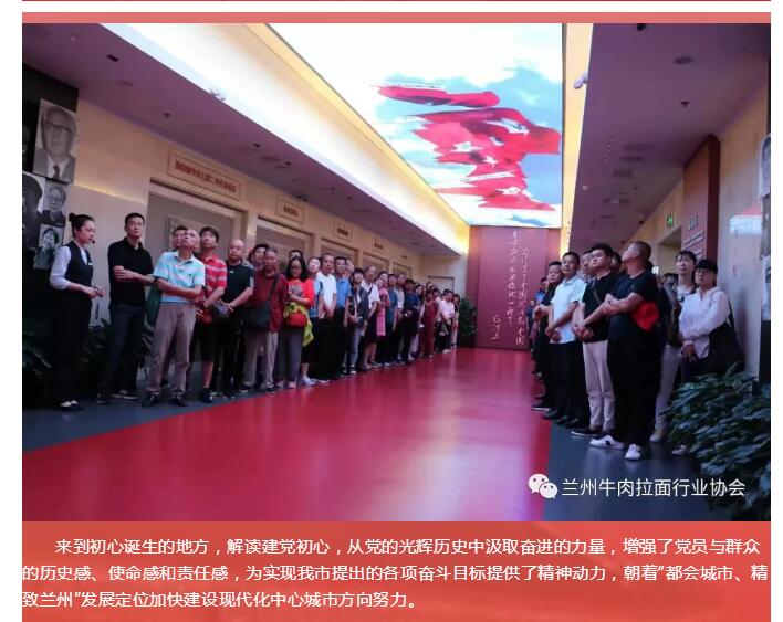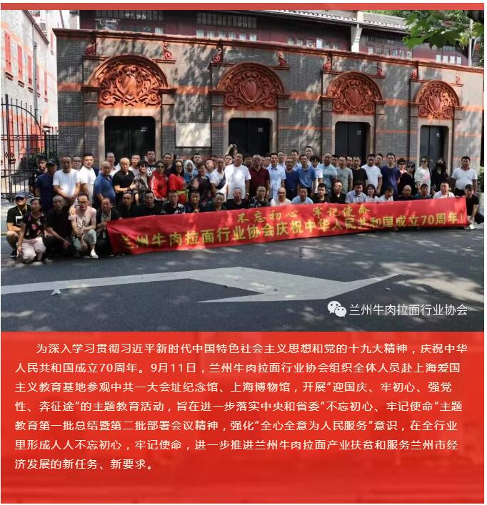 庆祝新中国成立70周年|百家兰州牛肉面企业赴上海参观中共一大会址 开展主题教育活动发布时间:2019-09-13文章来源:网友投稿本文作者:佚名所属分类:行业资讯 特别申明:本站的主旨在于收集互联网中兰州拉面(即兰州牛肉面、兰州牛肉拉面)相关资讯信息与行业信息,为广大网友提供便利。网站所收集到的公开内容均来自于互联网或用户投稿,并不代表本站认同其观点,也不对网站内容的真实性负责,如有侵权,请联系站长删除。